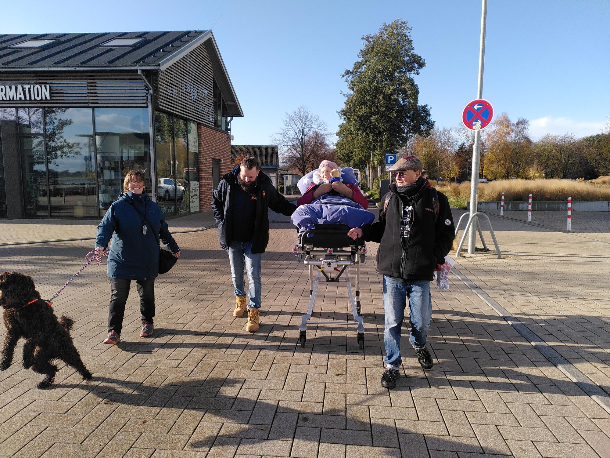 Die Fahrt war von entspannter, gelöster Stimmung geprägt. Karin hielt den Wünschewagenteddy fest im Arm, während sie sich immer mehr auf das Meer freute. Je näher wir dem Ziel kamen, desto lichter wurde der Himmel. Und dann, wie ein kleines Wunder, empfing uns Travemünde mit strahlendem Sonnenschein und blauem Himmel.