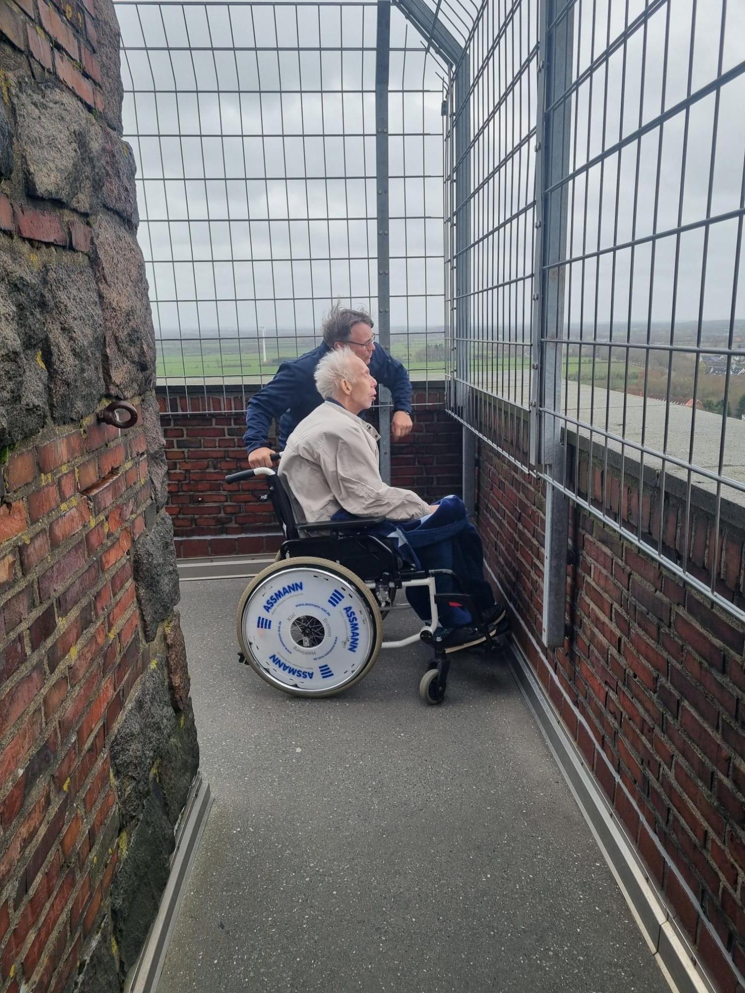 Ein weiterer Höhepunkt war die Auffahrt auf den hohen Turm. Oben angekommen, genossen wir die Weitsicht und die steife Brise, die um die Plattform wehte. Auf dem Weg im Fahrstuhl nach unten, gefragt, wie ihm der Ausflug gefallen habe, standen unserem Fahrgast feuchte Augen – so sehr hatte ihn der Tag berührt.